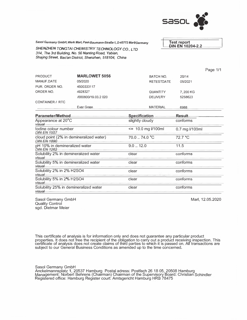五金酸銅中間體(ti)Marlowet 5056是沙索集團/Sasol産品(pǐn),專門爲電鍍行業(ye)研制并已經經過(guo)國際電鍍藥水企(qǐ)業及國内頭部藥(yao)水大廠的長期驗(yàn)證。