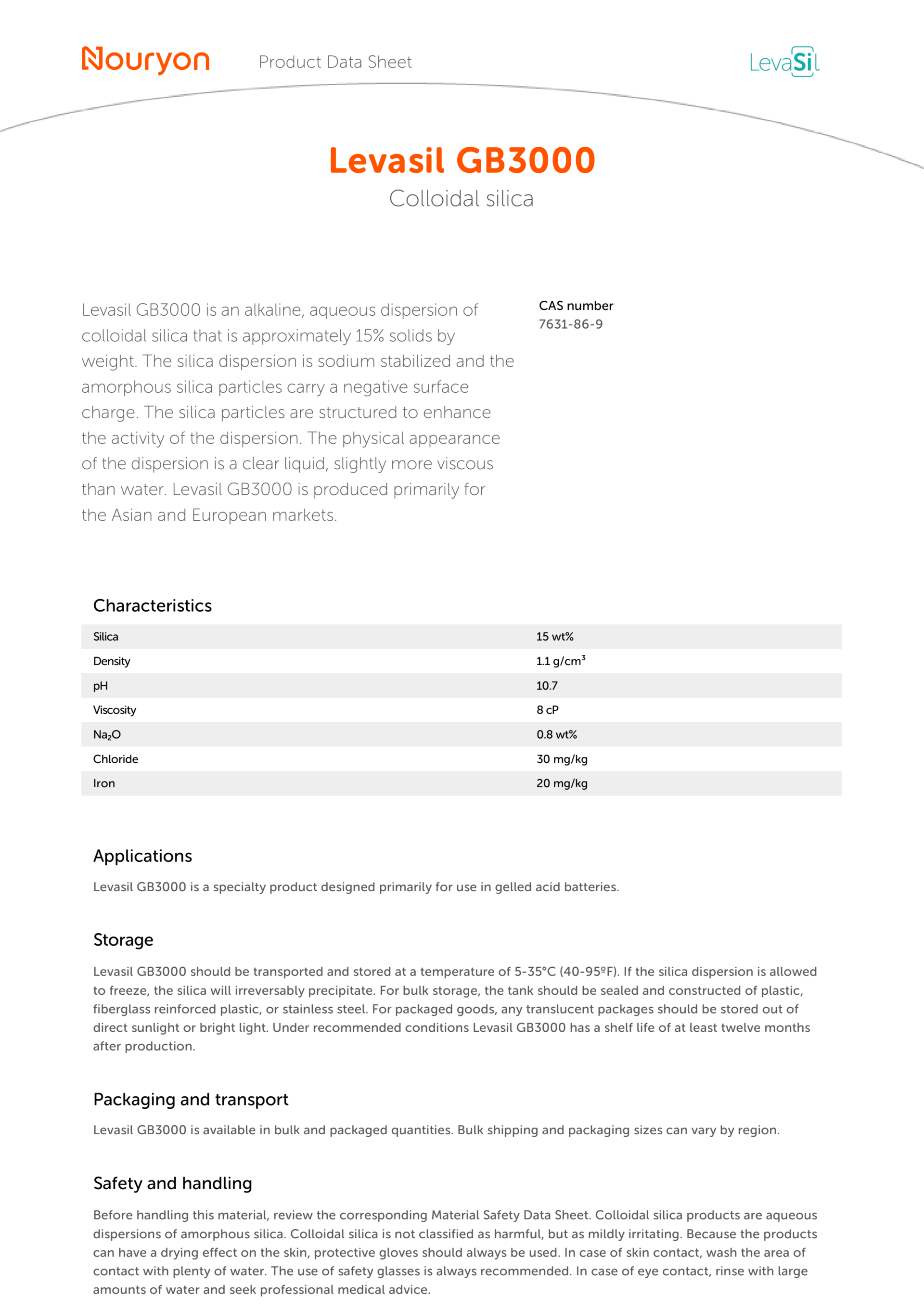 Levasil GB3000 is an alkaline, aqueous dispersion of colloidal silica that is approximately 15% solids by weight. The silica dispersion is sodium stabilized and the amorphous silica particles carry a negative surface charge. The silica particles are structured to enhance the activity of the dispersion. The physical appearance of the dispersion is a clear liquid, slightly more viscous than water. Levasil GB3000 is produced primarily for the Asian and European markets.