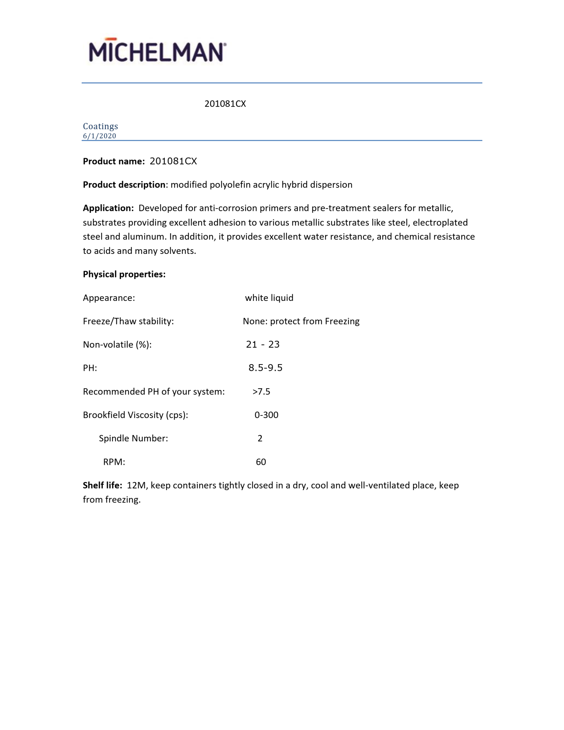 Application: Developed for anti-corrosion primers and pre-treatment sealers for metallic, substrates providing excellent adhesion to various metallic substrates like steel, electroplated steel and aluminum. In addition, it provides excellent water resistance, and chemical resistance to acids and many solvents.