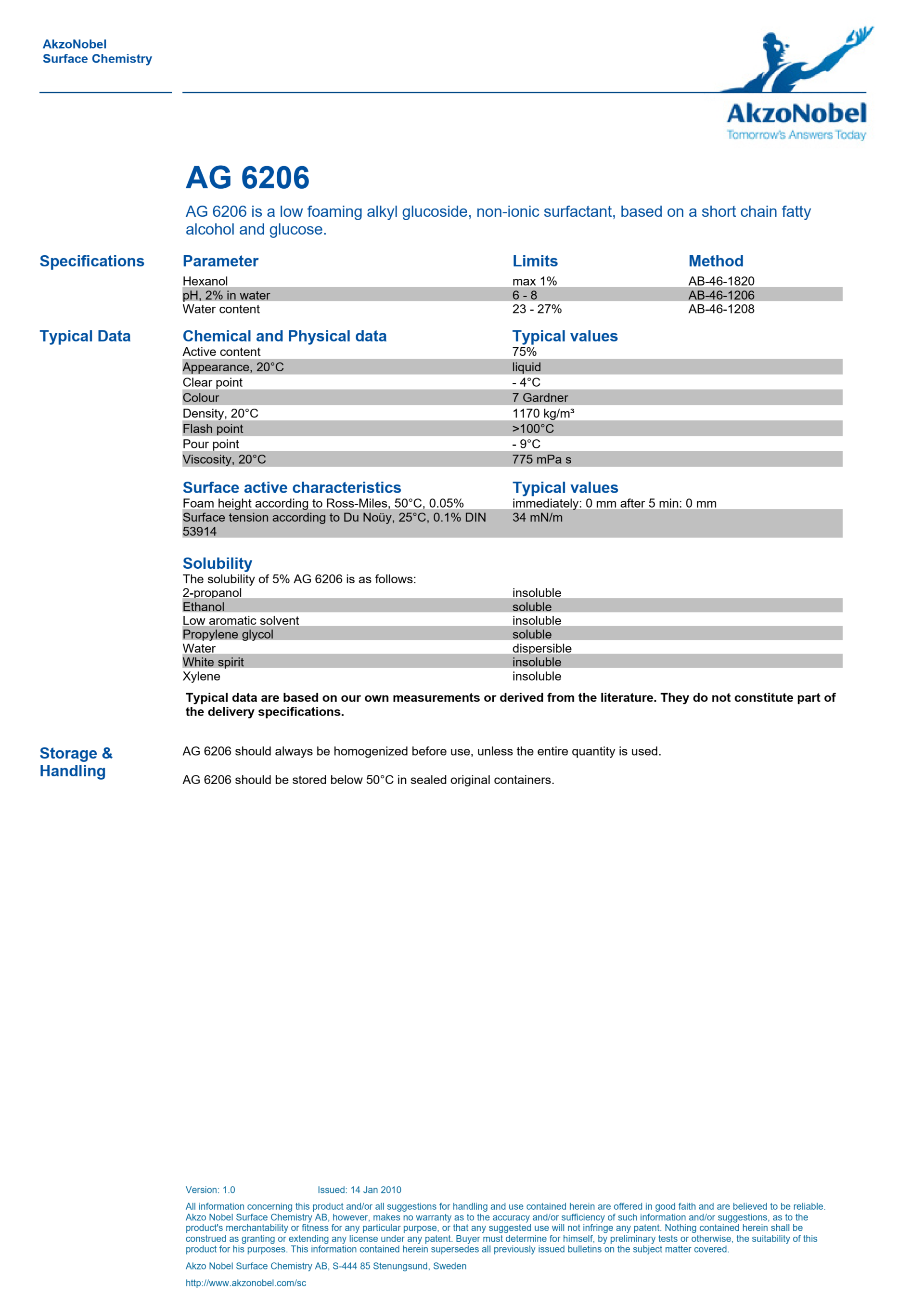 AG 6206 is a low foaming alkyl glucoside, non-ionic surfactant, based on a short chain fatty alcohol and glucose.