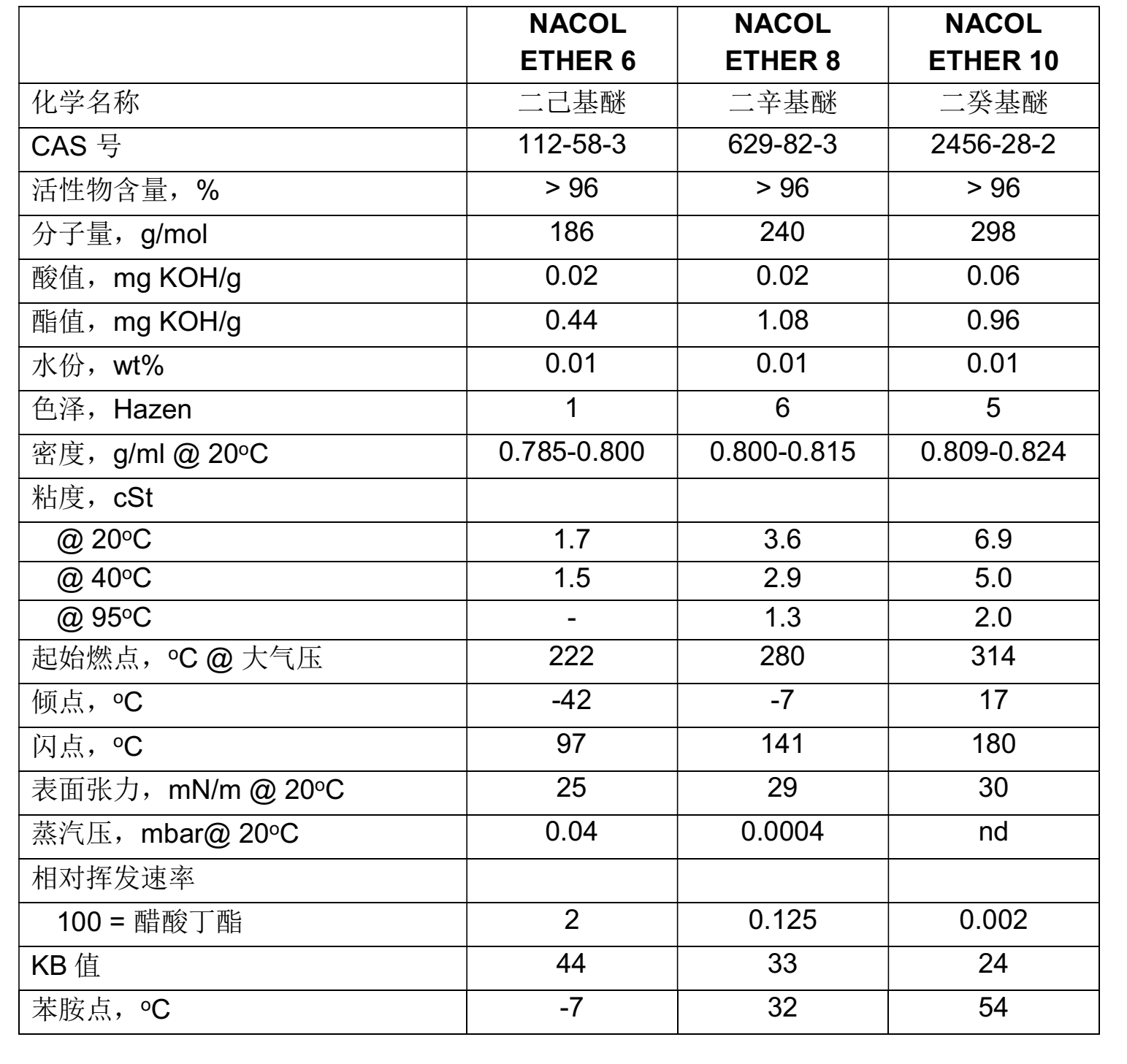 沙索化(hua)學直鏈二烷(wán)基醚NACOL ETHER 6二己基(ji)醚/NACOL ETHER 8二辛基醚(mí)/NACOL ETHER 10二癸基醚